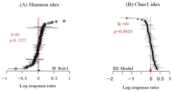 Fewer datasets were available on the effect of biochar application on fungal diversity. From the 95 papers that were analyzed, 85 datasets for fungal Shannon index and 69 datasets for fungal Chao1 index were identified. The effect of biochar addition on the fungal diversity (either Shannon or Chao1) was not significant compared to the control groups (p > 0.05, Figure 8). The limited number of studies that could be included here may have contributed to the non-significant results. In view of this, a subgroup analysis was not performed.