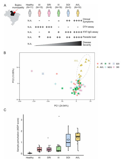 Blood transcriptome of individuals infected with L. (L.) chagasi. (A) Blood transcriptome from 67 individuals with AI, SRI, III, SOI, and SI (=AVL) profiles, or without infection (healthy control group), with L. (L.) chagasi from Bujaru municipality, Pará State, Brazilian Amazon, were used in our study. Individuals were grouped according to their clinical–immunological profiles. Clinical symptoms evaluated were: daily fever, weakness, weight loss, hepatosplenomegaly, and hematological changes, such as anemia, leukopenia, and thrombocytopenia. Parasite load was assessed by real-time PCR targeting Leishmania kinetoplast minicircles. DTH = delayed-type hypersensitivity assay; IFAT-IgG = indirect fluorescence antibody test. Semi-quantitative scales (+) follow Silveira et al. [12]. (B) Principal component analysis using the entire expression data. Colors represent the groups in (A). Explained variance is shown for PC1 and PC2 in parenthesis. (C) Molecular degree of perturbation (MDP score) of samples. The y-axis shows the MDP score using the healthy subjects as a reference group. The scores for each group of infected individuals are shown in the boxplots.