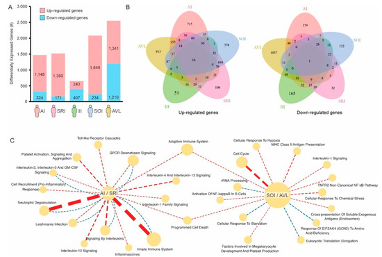 Gene signatures associated with individuals infected with L. (L.) chagasi. (A) Number of genes up- (red) or down-regulated (blue) on each group of infected individuals compared to healthy controls. (B) Venn diagram showing the number of genes shared by the different groups. (C) Reactome pathways specifically associated with individuals with AI/SRI (asymptomatic) profiles or SOI/AVL (symptomatic) profiles. Pathways enriched with up-regulated genes are connected by red dashed lines, whereas pathways enriched with down-regulated genes are connected by blue dashed lines. The thickness of the lines is proportional to the enrichment −log10 p-value.