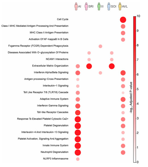 Pathway enrichment analysis using genes up-regulated on each profile was also performed (Figure 3). This analysis differs from the previous one where we utilized genes exclusively up- or down-regulated in specific profiles (Figure 2C). By utilizing all up-regulated genes of each profile (Figure 2A), we captured signatures that were shared between profiles. Despite the fact that the pathways related to cell cycle and MHC Class II antigen presentation were only enriched in individuals with SI profile (=AVL), most pathways were enriched in individuals with AI and SI (=AVL) profiles (Figure 3). Moreover, several pathways were shared and activated at the same level between SOI and SRI profiles, both with intrinsic genetic characteristics.