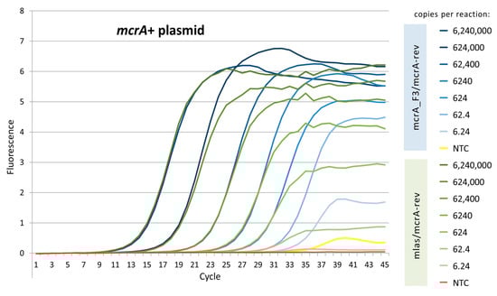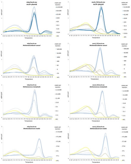 Both primer pairs were compared under very similar temperature conditions and timings as presented in the original study in order to exclude any additional effects on the assay performance. Since the amplicons generated with the use of the mcrA_F3/mcrA-rev primer pair were shorter and had a slightly lower melting temperature (Tm), the temperature of fluorescence acquisition had to be adjusted—it was set to 81 °C instead of 83 °C.