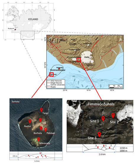 Locations of the Surtsey and Fimmvörðuháls sampling sites and the stations.