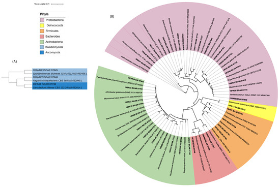 Phylogenetic tree of the partial 16S rRNA gene sequences of 40 strains cultivated in this study and type species of 40 different genera. (A) Eukaryotic strains. (B) Prokaryotic strains. One representative 16S rRNA gene sequence of each taxonomic group was selected to build a phylogenetic tree. Sequences were classified and aligned using the online portal of the SILVA Incremental Aligner (SINA 1. 2. 11) tool of the ARB-Silva database (http://www.arb-silva.de/aligner/, accessed on 20 August 2022). The tree computed with RAxML was imported in Interactive Tree of Life (iTOL) v6.4.