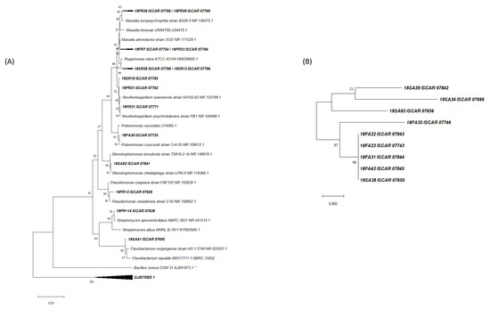 (A) Phylogenetic tree based on partial 16S rRNA gene sequences showing the relationship between the novel species isolated in this study and closest cultured strains. Sequences were aligned using MUSCLE algorithm and the tree was built using the maximum-likelihood method with a Kimura 2-parameter model and 1000 bootstrap replications, using MEGAX. A total of 20 sequences from this study were aligned with 17 from the literature. * Outgroup (Bacillus cereus). (B) Subtree 1 showing the relationship between the non-affiliated novel strains isolated in this study.