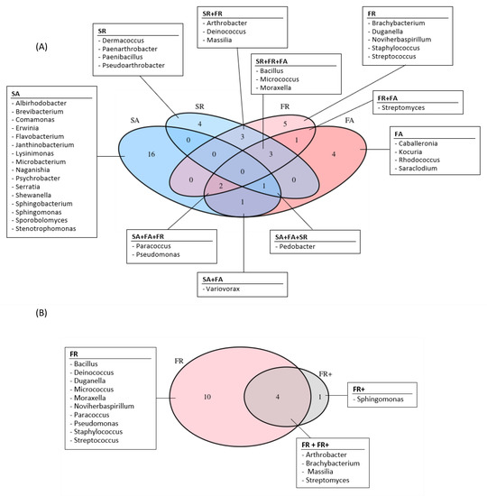 Venn Diagrams of the genera detected by cultivation. (A) Air and one-year-old lava rock samples. (B) One- and nine-year-old lava rocks from Fimmvörðuháls. S: Surtsey, F: Fimmvörðuháls, A: air, R: one-year-old lava rocks, R+: nine-year-old lava rocks.