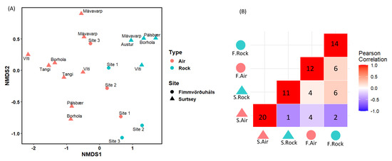 (A) NMDS ordination of the cultivable microbial community composition in the different stations of the sampling sites, based on the different genera cultivated from the air samples and the one-year-old lava rock samples. The ANOSIM statistic R and the significance for the type of sample, the sites, the stations, and the years were 0.5851/0.0001, 0.1063/0.1104, −0.1713/0.8798, and 0.07837/0.1496, respectively. (B) Pearson correlation matrix based on the cultivated genera for each sampling. Numbers represent the cultivated genera in the one-year-old lava rocks of Surtsey (S. Rock), the one-year-old lava rocks of Fimmvörðuháls (F. Rock), the air of Surtsey (S. Air) the air of Fimmvörðuháls (F. Air), and those in common between these samples. Statistical analyses were performed on RStudio using R (v 3.6.0).