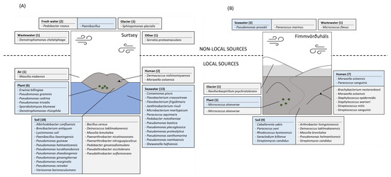 Surtsey is an island surrounded by seawater and exposed soil and plants are present in the area. Therefore, seawater, plant, soil, air and humans were considered local sources. Based on the analysis of the closest representative species of our isolates from Surtsey in the literature, we postulate that 89% of them came from local sources (40 strains of the 45 cultivated ones) (Figure 7A) with almost half of it previously isolated from soil, as e.g., Lysinimonas soli [40], and one third previously isolated from seawater, as e.g., Paracoccus aquimaris [41] and Flavobacterium frigidimaris [42]. Only five isolates were previously isolated from sources that are not present locally. For example, Sphingomonas glacialis was previously isolated from a glacier [43].
