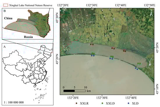 Sampling map. The study area was divided into three regions: the inlet of the river upstream of XXL (XXLR), near the dam of XXL (XXLD) and XL (XLD). (A) Map of China, (B) Location of Xingkai Lake National Nature Reserve, (C) Distribution map of sampling sites.