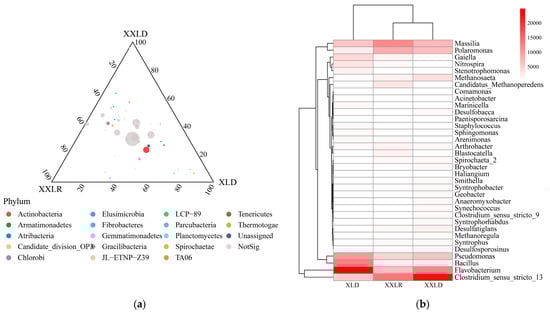 Sediment bacterial community composition among different regions. (a) Ternary plots of ASVs across three sampling regions. The size of each point represents the relative abundance of ASV. The position is determined by the contribution of three sampling regions to the total relative abundance, proximity to that vertex indicates enrichment of that ASV in that region. The colors of the circles correspond to different phyla. Grey circles indicate ASVs with no significant differences in abundance. (b) Heatmap displaying the absolute abundance of the top 35 genera. XXLR: the inlet of the river upstream of XXL, XXLD, and XLD: near the dam of XXL and XL.