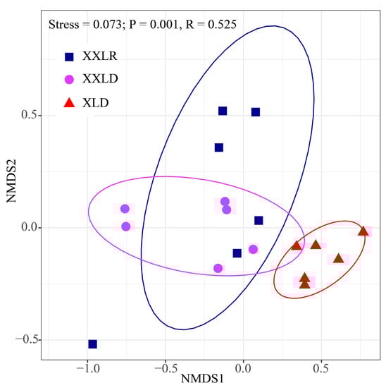 Nonmetric multi-dimensional scaling (NMDS) analysis based on Bray-Curtis dissimilarity at the ASV level of sediment bacteria. Significant differences among plant species and all radial layers were tested by analysis of similarities (ANOSIM) analysis. XXLR: the inlet of the river upstream of XXL, XXLD, and XLD: near the dam of XXL and XL.