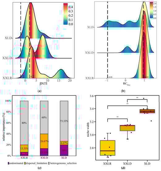 Distribution of phylogenetic turnover (βNTI; (a)) and taxonomic turnover (RCbray; (b)) and the percentages of the three assembly processes (c) and niche width (d). The vertical dashed lines mark the positions of −2 and 2 in panel a and −0.95 and 0.95 in (b). The percentages on the bar graph indicate the relative importance of different assembly processes (c). Significant differences of niche width across the regions were indicated by ** p < 0.01 (d). XXLR: the inlet of the river upstream of XXL, XXLD, and XLD: near the dam of XXL and XL.