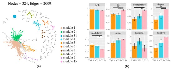 Co-occurrence networks and the subnetwork topological features. Visualization of constructed co-occurrence networks among all samples in different regions (a). Top 10 modules were shown in different colors, and smaller modules were shown in grey. Comparisons of subnetwork topological features in different regions (b). Data were shown as the mean ± standard error (n = 6). The significance was analyzed based on the Wilcox test: * p < 0.05, ** p < 0.01. APL: average path length; BC: betweenness centralization. XXLR: the inlet of the river upstream of XXL, XXLD, and XLD: near the dam of XXL and XL.