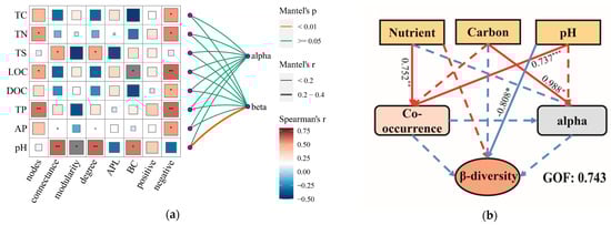 Considering the roles of biotic and abiotic factors, we conducted partial least squares (PLS) path analysis to explore how these factors determined microbe community diversity in the sediment. First, we examined the correlation between environmental factors and network topological features and community diversity (Figure 6). The results revealed that nutrient elements, including TN, TP, and TS, as well as the carbon components, were significantly correlated with the network features. Furthermore, pH showed a significant correlation with beta diversity. Then, we further employed PLS analysis with nutrient composition (TN, TP, TS), carbon composition (TC, LOC, DOC), and pH as environmental variables, combined with network topological features (nodes, connectedness, degree, betweenness centralization) to illuminate the direct and indirect contributions of biotic and abiotic elements to the impact of community diversity. The ultimate PLS analysis explicated 82.5%, 62.8%, and 69.0% of the variation in network characteristics and community diversity (α and β), respectively. This indicated that sediment physicochemical properties could alter network steady-state and determine the bacterial community diversity.