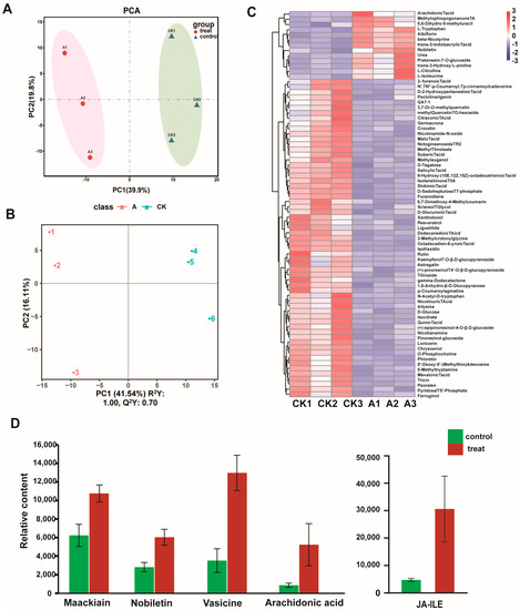 Data analysis of the metabolome in Mikania micrantha. (A) Principal component analysis (PCA) of metabolome data from healthy and infected leaves of M. micrantha. Axes showed the percentage of variance of the first two components (PC1, PC2). The circle represents the treatment group, and the triangle represents the control. (B) Partial least-squares discriminant analysis (PL−SDA) plots of untreated (control) and P. spegazzinii treated leaves. (C) Heatmap hierarchical clustering of differentially expressed metabolites. The content of each metabolite was normalized to complete hierarchical clustering. Each example was visualized in a single column, and each metabolite is represented by a single row. Red indicates high abundance, whereas low relative metabolites are shown in blue. (D) Secondary metabolite content associated with immune response in M. micrantha under P. spegazzinii stress. The error bars represent the means ± SD.