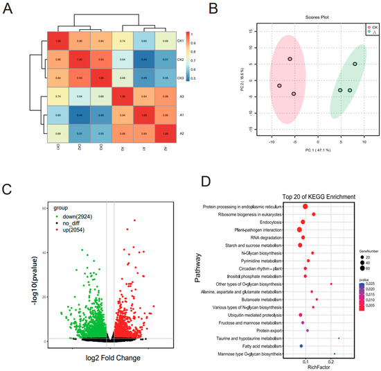 Data analysis of the transcriptome in Mikania micrantha. (A) Pearson correlations between CK (control) and A (treatment) replicates. (B) Volcano map of differential metabolites. Red plots indicate the up-regulated metabolites; Green plots indicate the down-regulated metabolites; Black plots indicate no significant difference. (C) Principle component analysis of expressed genes based on the gene expression profiles. (D) KEGG enrichment pathway of up-regulated genes. (E) GO classification of up-regulated genes.