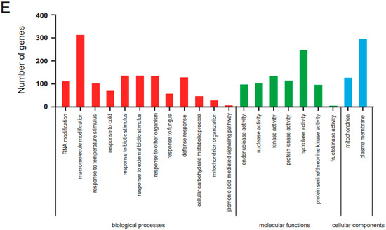 A summary of RNA-Seq data is shown in Supplementary Table S2. This summary reveals that the RNA-Seq data sets are high quality and reliable. After removing adapter reads, ambiguous reads, and low-quality reads, 6.391 Gb clean reads, on average, were produced. High correlations of FPKM value were observed (R > 0.84) between replicates under the same conditions (Figure 2A), indicating that the biological replicates were credible in this study. Principle component analysis (PCA) showed that the gene expression in the M. micrantha leaves under two different conditions was clearly separated by PC1 and PC2, which could explain 67.7% of the total variation (Figure 2B). Based on the transcriptome analysis between the P. spegazzinii-infected group (A) and non-infected (control) group, a total of 4978 DEGs (15.20% of total genes) were identified, including 2054 significantly up-regulated genes and 2924 significantly down-regulated genes (Figure 2C; Supplementary Table S3). These significantly up-regulated genes were significantly enriched in 10 KEGG pathways, including protein processing in the endoplasmic reticulum, ribosome biogenesis in eukaryotes, endocytosis, plant–pathogen interactions, etc. (Figure 2D; Supplementary Table S4). The expression of genes related to 20 pathways, including photosynthesis, metabolic pathways, the biosynthesis of secondary metabolites, carbon fixation in photosynthetic organisms, and the circadian rhythm of plants, were significantly suppressed (Supplementary Table S4). Further analysis of the up-regulated DEGs showed that these GO terms in biological processes were mainly involved in RNA modification, GO:0009451; macromolecule modification, GO:004341; responses to stimuli (temperature stimulus, GO:0009266; biotic stimuli, GO:0009607; and fungus, GO:0009620); cellular carbohydrate metabolic processes, GO:0044262; jasmonic acid-mediated signaling pathway, GO:0009864; and defense response, GO:0006952 (Figure 2E; Supplementary Table S4). Among molecular functions, endonuclease activity, GO:0004519; kinase activity, GO:0016301; phosphotransferase activity, GO:0016773; and hydrolase activity, GO:0016788 were enriched in the up-regulated DEGs (Figure 2E; Supplementary Table S4). For the cellular component (CC) category, the up-regulated DEGs in response to P. spegazzinii stress showed a clear enrichment in the mitochondrion, GO:0005739, and plasma membrane, GO:0005886 (Figure 2E; Supplementary Table S4). The expression of genes associated with photosynthesis, GO:0015979; oxidoreductase activity, GO:0016491; and thylakoid, GO:0009579, were significantly suppressed (Supplementary Table S4). All of the GO data are presented in Additional File 2.