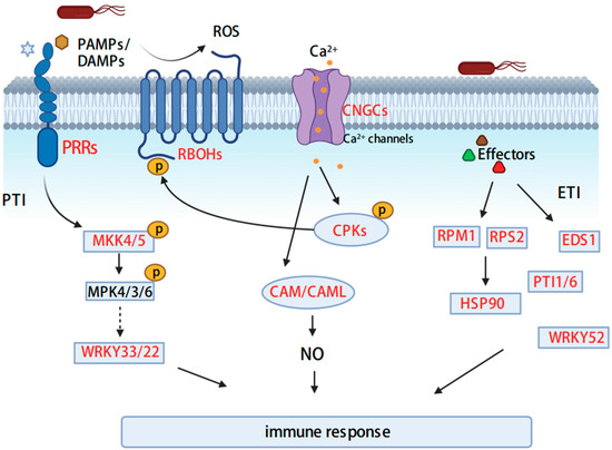 In addition, the key genes in the plant–pathogen interaction signaling pathway presented high expression following P. spegazzinii infection. In nature, plants are often attacked by pathogens. However, because the host plant has an effective immune system, the pathogen is perceived by two different recognition systems, which initiate so-called pattern-triggered immunity (PTI) and effect-triggered immunity (ETI), both of which are accompanied by a series of induced defenses [48,49]. PTI is a basal defense response activated by the recognition of PAMPs via pattern recognition receptors (PRRs) at the cell surface. Here, some PRRs were significantly up-regulated under P. spegazzinii stress (Figure 3 and Supplementary Table S5). Ca2+, reactive oxygen species (ROS), MAP kinase cascades, and WRKY transcription factors are considered to be essential components of all PTI-triggered defense responses [48,50]. The increase in cytoplasmic Ca2+ is considered to be an important early event in the response signal transduction cascade of plant infection pathogens, and the cyclic nucleotide-gated channel (CNGC) located in the plasma membrane (PM) contributes to the increase in cytoplasmic Ca2+during pathogen perception [51]. In M. micrantha, four CNGC genes are significantly up-regulated, which indicates that they may mediate Ca2+ influx (Figure 3 and Supplementary Table S5). CDPKs participate in the phosphorylation and activation of respiratory burst oxidase (RBOH), leading to ROS production [52]. The calcium-dependent protein kinase (CDPK), respiratory burst oxidase (RBOH) genes, and calmodulin (CAM) genes were induced to be up-regulated, which may have activated ROS production (Figure 3 and Supplementary Table S5). The MAPK cascade plays a very important role in the signal transduction of plant defenses against pathogen attacks. Arabidopsis AtWRKY22 and AtWRKY29 proteins are essential components of MAPK-mediated plant defense responses against pathogens [53]. In Arabidopsis, WRKY33 plays a key role in the stress response, and WRKY33 overexpression enhances resistance to fungal pathogens [54,55]. In our study, mitogen-activated protein kinase kinase 4/5 (MKK4/5) and WRKY33/22 genes were induced to be up-regulated, which may be related to the activation of plant immunity (Figure 3 and Supplementary Table S5). In our study, we also found that RPM1, RPS2, HSP90, and EDS1 were up-regulated dramatically in M. micrantha after inoculation. Previous studies have shown that the expression of these genes is associated with the triggering of ETI [56,57]. These results suggested that when M. micrantha was infected by P. spegazzinii, it activated a defense response, but this does not necessarily imply resistance.