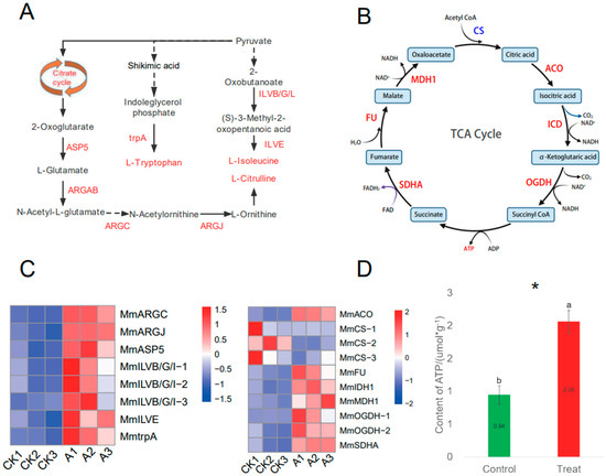 Gene expression and metabolite content of amino acid metabolism and TCA cycle pathway in M. micrantha under P. spegazzinii stress. (A) Pathway of amino acid metabolism; (B) pathway of the TCA cycle. The gene expression levels were denoted in blue (down-regulated) and red (up-regulated). Metabolite content is represented in blue (down-regulated) and red (up-regulated). (C) Expression pattern of key amino pathway genes in M. micrantha; ILVB/G/L: acetolactate synthase I/II/III large subunit; IMS: 2-isopropylmalate synthase; trpA: tryptophan synthase alpha chain; ILVE: branched-chain amino acid; ARGJ: glutamate N-acetyltransferase; ARGC: N-acetyl-gamma-glutamyl-phosphate reductase; ARGAB: amino-acid N-acetyltransferase; ASP5: aspartate aminotransferase, chloroplastic. Expression pattern of key TCA cycle genes in M. micrantha; SDHA: succinate dehydrogenase (ubiquinone) flavoprotein subunit; FU: fumarate hydratase, class II; MDH1: malate dehydrogenase 1; CS: citrate synthase; ACO: aconitate hydratase; ICD: isocitrate dehydrogenase; OGDH: 2-oxoglutarate dehydrogenase E1 component. (D) Changes in the contents of ATP by the P. spegazzinii infection; Significant differences are indicated according to Student’s t test: *, p < 0.05. The error bars represent the means ± SD.