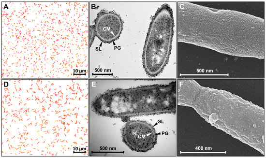 Overview of Gram type, cell wall structure, and surface layers of A. propionicum (A–C) and A. neopropionicum (D–F). Pictures were obtained using light microscopy, transmission, and scanning electron microscopy. (A,D) Results of Gram staining; (B,E) results of transmission electron microscopic analyses; (C,F) results of scanning electron microscopic analyses. CM, cytoplasmic membrane; PG, peptidoglycan; SL, surface layer.
