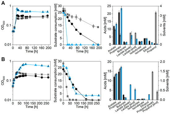 Overview of growth experiments conducted with A. propionicum and A. neopropionicum using different carbon sources. (A) Growth (OD600, (left)), substrate consumption (middle), and product formation (right) of A. propionicum; (B) growth (left), substrate consumption (middle), and product formation (right) of A. neopropionicum. Black circles, growth with D-lactate; grey squares, growth with ethanol; blue triangles, growth with L-alanine (A. propionicum) or xylose (A. neopropio-nicum). Error bars represent standard deviations, n = 3.