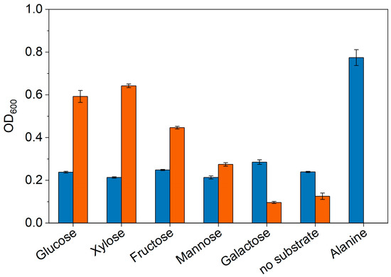 Growth of A. propionicum (blue) and A. neopropionicum (orange) in presence of 50 mM sugar. Cultures without supplementation of a substrate served as a negative control, addition of 50 mM L-alanine served as a positive control for growth of A. propionicum. Cultivation was performed in 5 mL respective medium with supplemented carbon sources. Starting OD600 was set to 0.1 for A. propionicum and 0.05 for A. neopropionicum. Error bars represent standard deviations, n = 3.