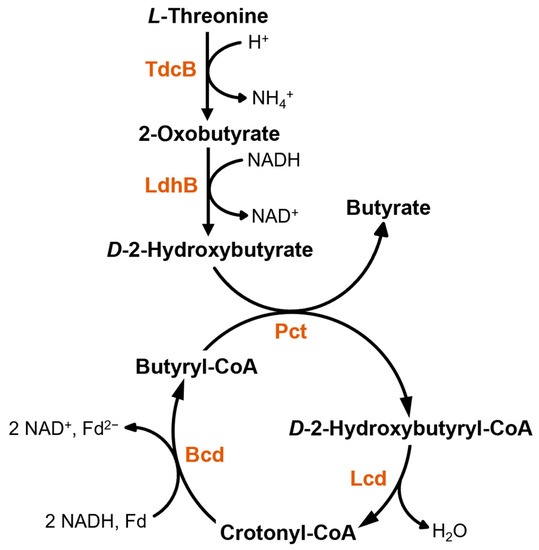 Proposed pathway for butyrate formation in Anaerotignum strains (based on [19]). TdcB, L-threonine dehydratase (CLNEO_20890, CPRO_03900); LdhB, L-lactate dehydrogenase (CLNEO_01790, CPRO_00680); Pct, propionate CoA-transferase (CLNEO_17700, CPRO_08400); Lcd, lactoyl–CoA dehydratase (CLNEO_17710-17730, CPRO_08370-08390); Bcd, butyryl–CoA dehydrogenase (CLNEO_29840-29850 or CLNEO_21740-21760, CPRO_28160-28180).