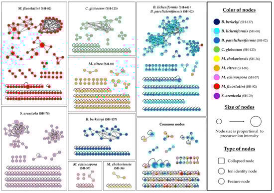 Ion Identity Molecular Network (IIMN) of the 9 microbial extracts. Node’s color describes the bacterial species, node’s shape is related to the adduct type and the collapsed property and node’s size is proportional to precursor ion intensity (The figure is in high definition, with the possibility of zooming-in).