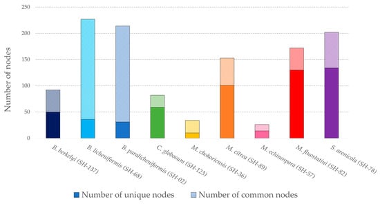 This network makes it easy to observe the distribution and specialization of microbial metabolites, each strain being represented by a distinct color. The shape of the nodes represents: the grouping of several adducts into a single node (cluster node) and the identification of a single adduct (ion identity node), such as [M+H]+ or nodes whose adduct could not be identified (feature node). Their size is proportional to the precursor ion intensity. Most of the nodes in the network are unique to each species, and only some of them are common to two or more strains. These nodes are grouped in the box on the bottom right side, and despite the annotation effort, they did not allow the identification of remarkable compounds. The framework at the top right represents the Bacillus paralicheniformis SH-02 and B. licheniformis SH-68 extracts. It consists of the largest cluster composed of 99 nodes, 75% of which are common to both strains. There are six large clusters (>10 nodes) specific to one species or to both Bacillus strains. Two of these clusters come from Salinispora arenicola SH-78′s extract. Figure 2 shows the number of strain-specific nodes and the ones common to several strains.