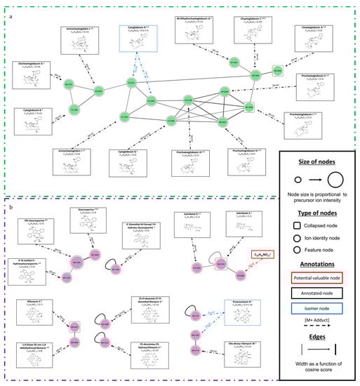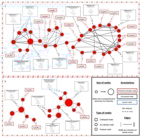 Main annotated clusters from the crude extract of Micromonospora fluostatini SH-82 (red node). (a) Main cluster representing the natural product class of erythromycins and (b) set of clusters representing the erythronolides family and derivatives. Superscript numbers in the annotations correspond to data from 1 SIRIUS, 2 GNPS or 3 ISDB timaR bioinformatics tools. (The figure is in high definition, with the possibility of zooming-in).