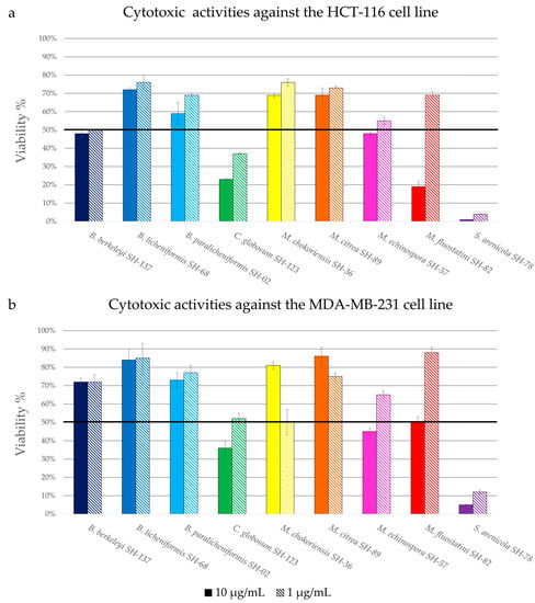 Cytotoxicity of the crude microbial extracts against the HCT-116 (a) and the MDA-MB-231 (b) cell lines, showing the ratio of viability. The different colors correspond to the different microbial strains. Horizontal black line indicates the threshold for promising strains (viability < 50%).