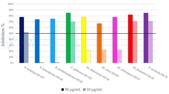 All the extracts exhibit more than 50% inhibition at a concentration of 50 µg/mL, therefore, the activity was evaluated at a lower concentration (10 µg/mL). Among these extracts, the results considered as promising were obtained with Bacillus berkeleyi SH-137, Chaetomium globosum SH-123, Micromonospora fluostatini SH-82 and Salinispora arenicola SH-78, which showed inhibition percentages exceeding 50% at the lowest concentration of 10 µg/mL. The inhibition rates reached 52%, 70%, 71% and 71% respectively. This preliminary analysis makes it possible to quickly screen the extracts of interest before carrying out a second more precise analysis.
