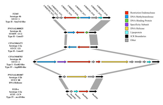 Type II RM systems were previously identified in serotype 4b strains, including in the hypervirulent clones CC1 and CC6 [30,31,32], with the CC6-specific RM system LmoH7 conferring temperature-regulated resistance to all tested wide host range phages [31]. With the exception of LmoH7, these RM systems were localized between lmo0301 and lmo0305 homologs [32], identified as one of the major chromosomal hotspots in L. monocytogenes [33]. Type II RM systems were also found to be the most common RM system type in an analysis of 318 genomes of L. monocytogenes, with GATC being the most common recognition motif [34]. Previously, a region of the Escherichia coli chromosome, which included the type I RM system EcoKI and type IV methylation-dependent Mrr system, as well as a chromosomal region of the plant pathogen Xylella fastidiosa which harbored type I RM systems, were termed the “immigration control region” (ICR) [35,36]. Due to the high prevalence of RM systems in this chromosomal hotspot (lmo0301-lmo0305) in L. monocytogenes, we deemed it appropriate to also refer to this region as ICR [37]. In this study, our objective was to harness whole-genome sequence data from a large panel of diverse strains of L. monocytogenes to investigate the genomic content and distribution of RM systems in the ICR and to assess the possible implications for susceptibility to lytic phages.