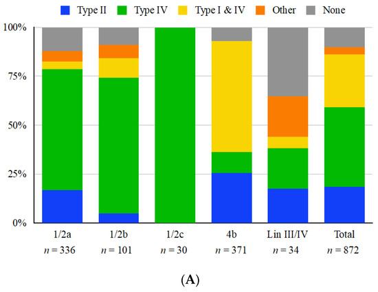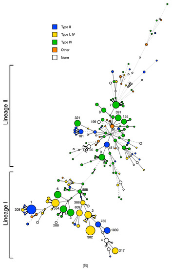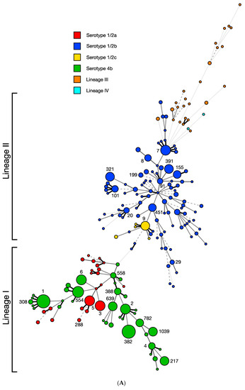 The 872 L. monocytogenes included 192 sequence types (STs) based on the seven-locus multilocus sequence typing (MLST) scheme, distributed among different serotypes, with most STs belonging to lineage I or II (Figure 3A). Lineage III or IV consisted of a number of highly diverse STs (Figure 3A), in agreement with the previously documented pronounced genetic diversity of these uncommon lineages [17,18,19,50].