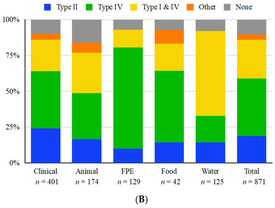 We were unable to identify strong links between isolation source and presence of RM systems (R-Squared < 0.065) (Figure 2B). However, approx. 59% strains from water were found to harbor type I and IV RM systems in their ICR, noticeably more than strains from other sources (Figure 2B; Table S1). This may reflect the fact that a majority of the water-derived strains were serotype 4b, namely the water-associated STs 217, 382, 639 and 663 [46,47]. As indicated above, serotype 4b strains frequently harbored type I and IV systems in the ICR. These higher levels of type I and IV RM systems in serotype 4b water isolates (81.2%) as compared to other source types (≤58.2%) may indicate a selective pressure unique to aquatic environments. Natural environments such as surface waters remain undersurveilled, but recent studies have shown a large amount of diversity [47,48,49].