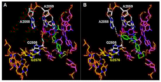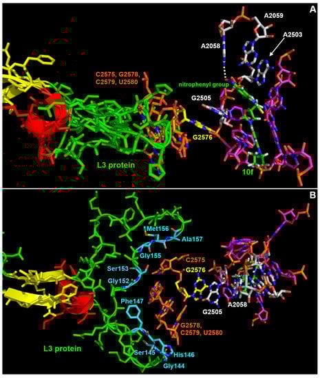 In particular, the nitrophenyl–urea moiety makes van der Waals contacts with A2503, G2505, and A2059. Moreover, the nitro group is involved in a H-bond with the N6 of A2058 (Figure 2B and Figure 4A). The additional and extended van der Waals contacts of the nitrophenyl-urea moiety with G2505 are particularly interesting as the base of this nucleotide is staked on the base of G2576 that is mutated to U in several linezolid resistant strains [22] (Figure 2, Figure 3 and Figure 4). Likely, the substitution of a purine with a pyrimidine at position 2576 makes the surroundings of G2505 more flexible, thus reducing the interaction with linezolid. In the case of 10f, the additional stacking interaction between the nitrophenyl ring and G2505 (Figure 2B, Figure 3A and Figure 4A) would counterbalance the increased mobility of this nucleotide, thus allowing a strong interaction of 10f with the mutated ribosome.