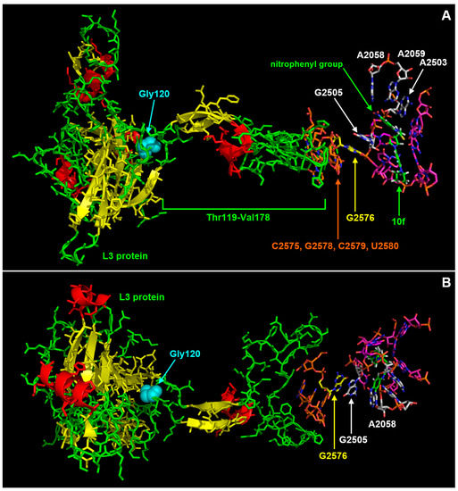 Molecular contacts between L3 and the nucleotides in the linezolid binding pocket. The image in panel (B) is rotated by 90° along the left–right axis with respect to (A). L3 is shown as sticks and cartoon images except for residue Gly120, shown as spheres. 10f and the surrounding nucleotides are shown as sticks. L3 is colored according to the secondary structure (helices, red; strands, yellow; loops, green) except Gly120, shown in cyan. In the case of 10f and of the surrounding nucleotides the color code is the same as in Figure 2.