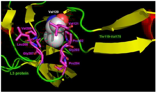 Close-up of the L3 region surrounding position 120. A valine residue is shown at position 120 to highlight the close contacts with residues 202–204 and 207–209. Residues are colored by atom type: nitrogen atoms are shown in blue, oxygen in red, carbon atoms of Val120 are in light gray, and carbon atoms of residue at close contact with Val120 side chain are in magenta.