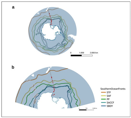 - Belkin, I.M.; Gordon, A.L. Southern Ocean fronts from the Greenwich meridian to Tasmania. J. Geophys. Res. Oceans 1996, 101, 3675–3696. [Google Scholar] [CrossRef]