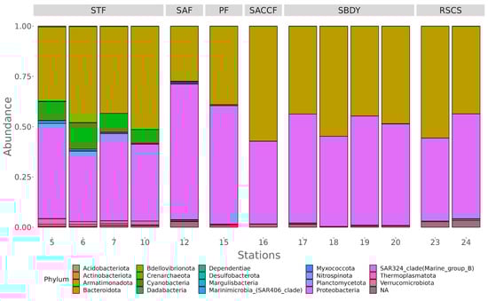 As shown in Figure 2, in the station belonging to STF (stations 5, 6, 7, and 10), we mainly found Proteobacteria (recently reclassified as Pseudomonadota), Bacteroidota, and Cyanobacteria with an average of 44.78%, 40.94%, and 9.64% of reads assigned, respectively. Station 12, present on the SAF, had a similar distribution, with Proteobacteria (67.43%) and Bacteroidota (27.36%) being the two most abundant phyla, followed by Myxococcota (0.35%). Reads from the only station influenced by the PF (station 15) were also assigned to Proteobacteria (58.85%), Bacteroidota (38.92%), and Cyanobacteria (0.57%). In the case of station 16, associated with the SACCF, 57.16% of the reads were assigned to Bacteroidota, while 41.10% corresponded to Proteobacteria. In stations 17, 18, 19, and 20, all influenced by the SBDY, we mainly found Proteobacteria (50.90%) and Bacteroidota (47.84%), with Verrucomicrobiota having assigned just 0.12% of the reads. Finally, the two stations (23 and 24) belonging to the RSCS were also characterized by a predominance of Bacteroidota (49.57%) and Proteobacteria (46.69%), with nearly 0.1% of the reads (0.06%) assigned to the SAR324 clade (Marine group B).