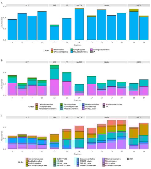 Within the Bacteroidota, the Bacteroidia class was the most abundant among the stations influenced by the STF, SACCF, and RSCS, with average reads assigned of 36.91%, 57.16%, and 55.64%, respectively, while the stations influenced by the SAF, SPF, and SBDY, had an average of reads assigned equal to 27.36%, 38.92%, and 33.80%, respectively. At the order level, Flavobacteriales represent the most abundant order, similarly distributed in all stations (Figure 3A), with the exception of station 12 (influenced by the SAF front), with an average of reads assigned of 44.43%, 38.66%, 55.06%, 46.59%, 45.91%, and 24.36% to the stations influenced by STF, SPF, SACCF, SBDY, RSCS, and SAF, respectively.