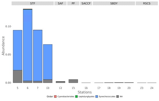 As mentioned before, sequences belonging to the phylum Cyanobacteria were detected mainly in the four northern stations of the transect (9.6% relative abundance), all influenced by the STF. In particular, within this phylum, most sequences are affiliated with the Synechococcales order (Figure 4).