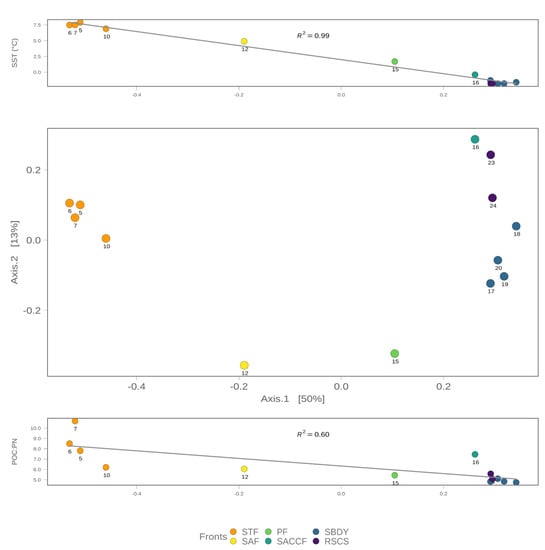 Principal Coordinate Analysis using a weighted Jaccard similarity distance illustrating the shifts in the community structure according to Southern Ocean waterfronts. SST—Sea Surface Temperature; POC:PN—Ratio between Particulate Organic Carbon and Particulate Nitrogen; STF—Sub-Tropical Front; SAF: Sub-Antarctic Front; PF—Polar Front; SACCF—Southern Antarctic Circumpolar Current Front; SBDY—Southern Boundary Front; RSCS—Ross Sea Continental Shelf. The amount of variance explained by each axis is reported within square brackets.