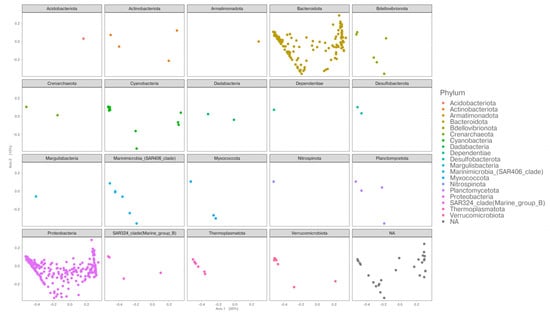 To explain the bacterial community structure across the different fronts, we performed a principal coordinate analysis (PCoA) based on the relative abundance of the assigned ASVs to each station and generated using a weighted Jaccard similarity distance. The first two axes of the PCoA were able to explain about 63% of the variance. As shown in Figure 5, there is a “U” pattern along Axis 1, also known as a “horseshoe” effect. This pattern has been associated with species turnover along an environmental gradient [54]. The site distribution follows a latitudinal trend, from north to south, with the only exception of station 16. The ASVs that mainly contribute to the distribution of our samples within the PCoA ordination are shown in Figure 6. Bacteroidota and Proteobacteria are distributed within the whole ordination, together with Cyanobacteria, Verrucomicrobia and Actinobacteriota, while the left part of the ordination is more characterized by Marinimicrobia, Thermoplasmatota, and Bdellovibrionota.
