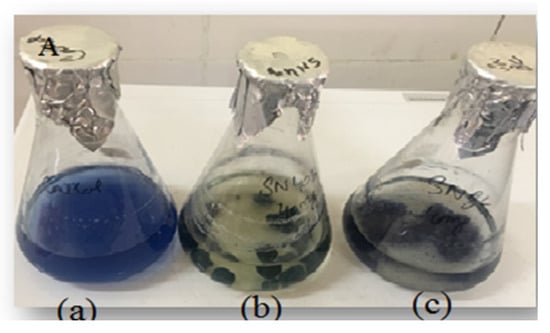 The decolorization of RBB dye in liquid medium: (a) control, (b) SN40b, and (c) SN8c.