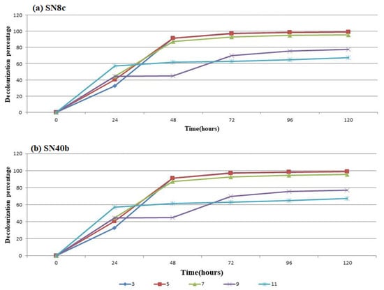 The decolorization of RBB dye using the SN8c and SN40b selected fungal strains was estimated after 5 days and it was observed that SN8c and SN40b decolorized more than 85% of RBB dye at a lower pH (~5) and neutral pH (~7) after 48 h. On the other hand, the activity was very low after 24 h, decreased to 70% after 48 h at a higher pH (~11), and remained constant over time (Figure 2).