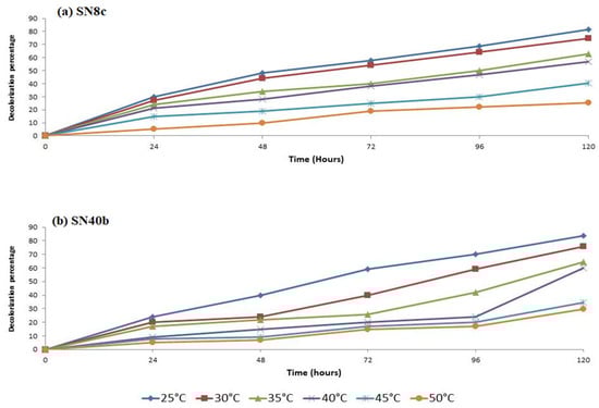 The effect of temperature on the decolorization of RBB dye using selected fungal isolates was determined under different temperature conditions ranging from 25 °C to 50 °C (Figure 3). More than 80% of RBB dye decolorization was observed for both fungal isolates (SN8c: 83% and SN40b: 81.7%) after 5 days of incubation at 25 °C. On the other hand, the decolorization of the dye was significantly less at 50 °C after 5 days; up to 25% less for SN40b and up to 30% less for SN8c.