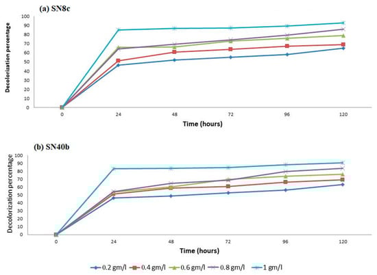 This study revealed that the fungal strains SN40b and SN8c have RBB dye decolorization capabilities of up to 95% after five days of treatment. In this regard, Afiya, et al. [] reported the decolorization capabilities of Pleurotus ostreatus and Coriolus versicolor of up to 70% and 80%, respectively, against RBB dye in eight days of treatment. The strains evaluated in this study showed better results than the previously reported fungal isolates. Moreover, physiochemical parameters greatly affect the decolorization capability of microorganisms including pH, temperature, dye concentration, carbon source, and other essential nutrients. The dye concentration plays a pivotal role in the decolorization of the dye when using microbes. The inoculation of Aspergillus fumigatus (SN8c) and Aspergillus terreus (SN40b) revealed maximum decolorizations of up to 77% and 86% at a concentration of 40 mg/L, respectively. However, the capacity of decolorization was reduced by up to 60% at an RBB dye concentration of 100 mg/L. Our findings are consistent with the study of Ramya, Anusha, Kalavathy, and Devilaksmi [], in which they reported the decolorization of Acid-Red 151 by using A. flavus SA2 (93%), A. terreus SA3 (88%) and A. niger SA1 (82%) at a low concentration (50 mg/L).