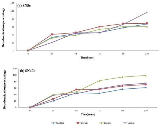 The effect of different carbohydrate sources was investigated by providing equal amounts of fructose, glucose, sucrose, and lactose in the media (Figure 5). The maximum decolorization of RBB dye using inoculated fungal strains (SN8c and SN40b) was observed in the media supplemented with lactose and sucrose. The fungal strain SN40b showed 93.58% decolorization in the presence of sucrose, whereas SN8c revealed 96.23% decolorization in the presence of lactose. The lowest decolorization activity in the media containing fructose was 56% and 67% for SN40b and SN8c, respectively.