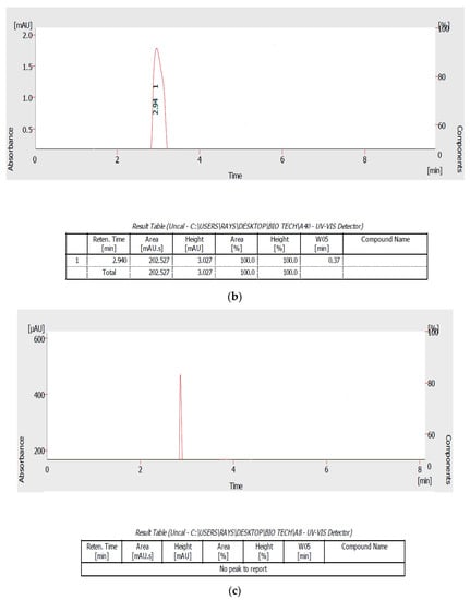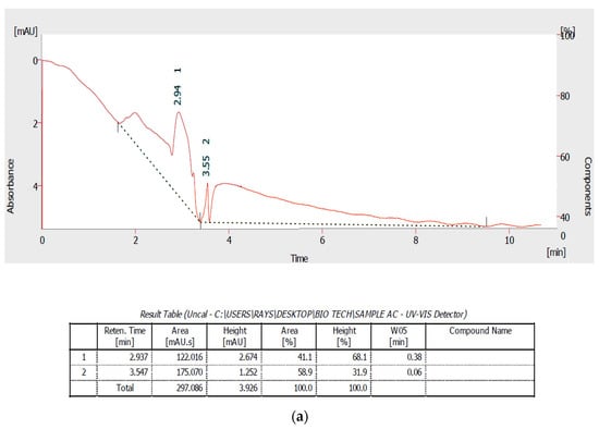 For the evaluation of the biodegradabilities of the products, high-performance liquid chromatography (Shimadzu HPLC) was used. The detailed method of Lade, et al. [] was followed for the biodegradation analysis. Briefly, HPLC analysis was carried out on a C-18 column (250 × 4.6 mm) with Methanol:Acetonitrile (1:1) (99.9% HPLC grade, Honeywell, France) as a mobile phase in the HPLC with a flow rate of 1.0 mL/min and UV detection at 590 nm.