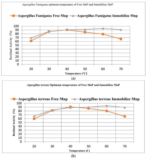 Temperature is considered an important factor while dealing with immobilized enzymes, and the thermostabilities of immobilized and free MnP were investigated by incubating at different temperatures (ranging from 20 °C to 70 °C), and the residual activity was noted at the indicated time. Agar–agar-entrapped MnP from A. fumigatus were noted to have the highest thermostability compared to its free enzymes, with 86.1% activity at 60 °C and 77.8% at 70 °C, while free enzymes resulted in 57% and 38% activity, respectively. Further, at 20 °C, 30 °C, 40 °C, and 50 °C, the entrapped MnP resulted in 54.2%, 62.1%, 68.2%, and 76.9% activity, while free MnP was noted to have activities of 52%, 75.8%, 85.8%, and 69%, respectively (Figure 8a,b).